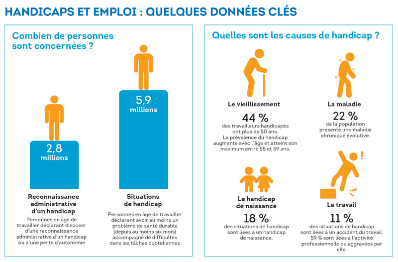Actuellement, on dénombre près de 5,9 millions de Français en âge de travailler souffrent d’une maladie chronique et 2,8 millions de personnes sont en situation de handicap reconnu administrativement, un chiffre qui a doublé en 15 ans.